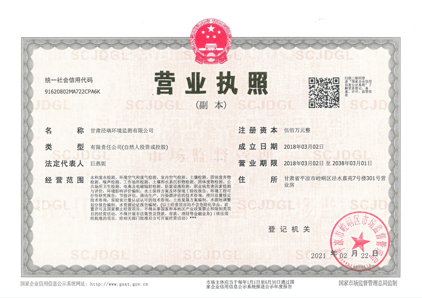 甘肅涇瑞環(huán)境監(jiān)測有限公司 電話:0933-8693665 地址:甘肅省平?jīng)鍪嗅轻紖^(qū)涇水嘉苑7號(hào)樓301號(hào)營業(yè)房