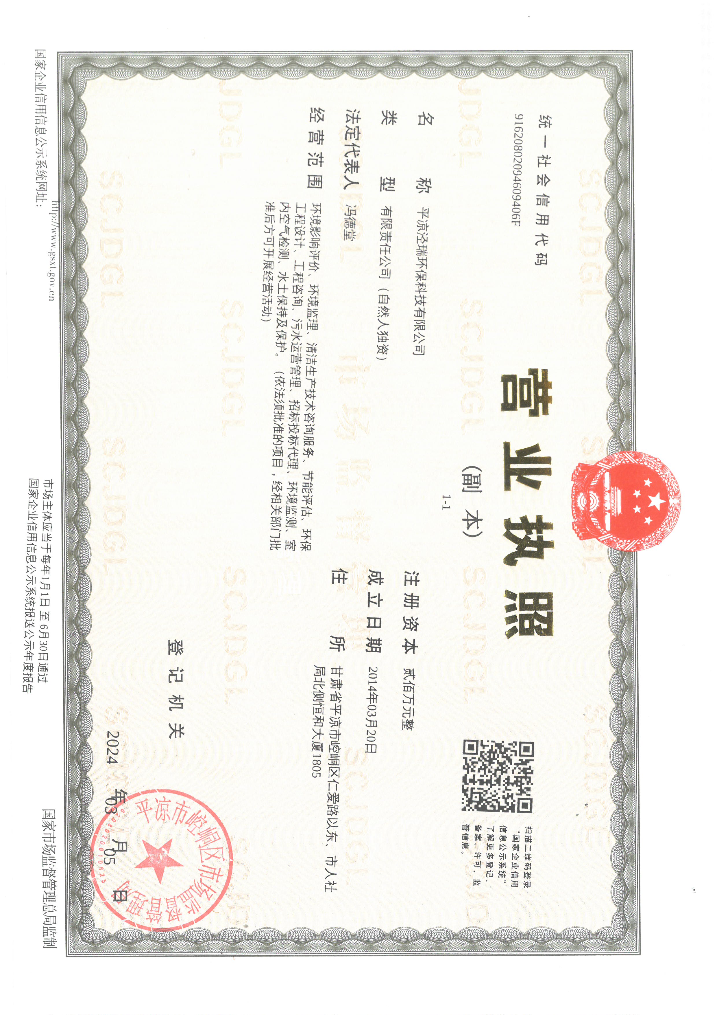 平?jīng)鰶苋瓠h(huán)保科技有限公司 電話:18093310035 地址:甘肅省平?jīng)鍪嗅轻紖^(qū)仁愛路以東、市人社局北側(cè)恒和大廈1805